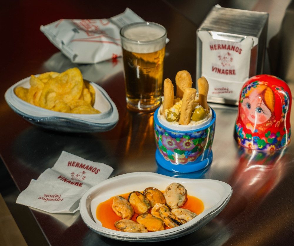 Al más puro estilo cañí, Hermanos Vinagre ofrece también auténticos iconos de la gastronomía madrileña recién salidos de cocina como su bocadillo de calamares, sus patatas bravas y su versión de ensaladilla rusa. Sus cinco locales ubicados en los barrios de Ibiza, Chueca, Chamberí y Lavapiés, se han convertido en templos del aperitivo donde no faltan los chatos de vino, las cañas bien tiradas y un buen vermú.