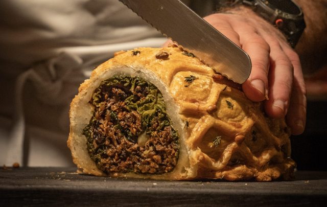 La duxelle, elemento esencial del Wellington, adquiere aquí un papel protagonista. Junto a los champiñones y las chalotas tradicionales, el equipo de cocina incorpora setas de temporada como angulas de monte, chantarelas y trompetas de la muerte, integrando la temporalidad en la receta y aportando mayor complejidad aromática. El conjunto se aromatiza con tomillo, salvia y vino de Jerez, sumando profundidad y elegancia al plato.