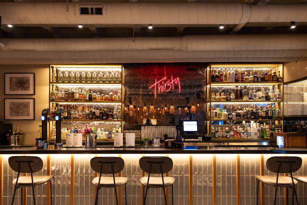 El interiorismo acompaña este nuevo momento recuperando la esencia del Marieta original. Vuelven los paneles de madera natural y se apuesta por una simplificación de materiales que refuerza su identidad. Una reconceptualización que pone en valor el carácter del espacio desde una mirada contemporánea, en diálogo con el edificio más nuevo y moderno que hoy lo acoge.
